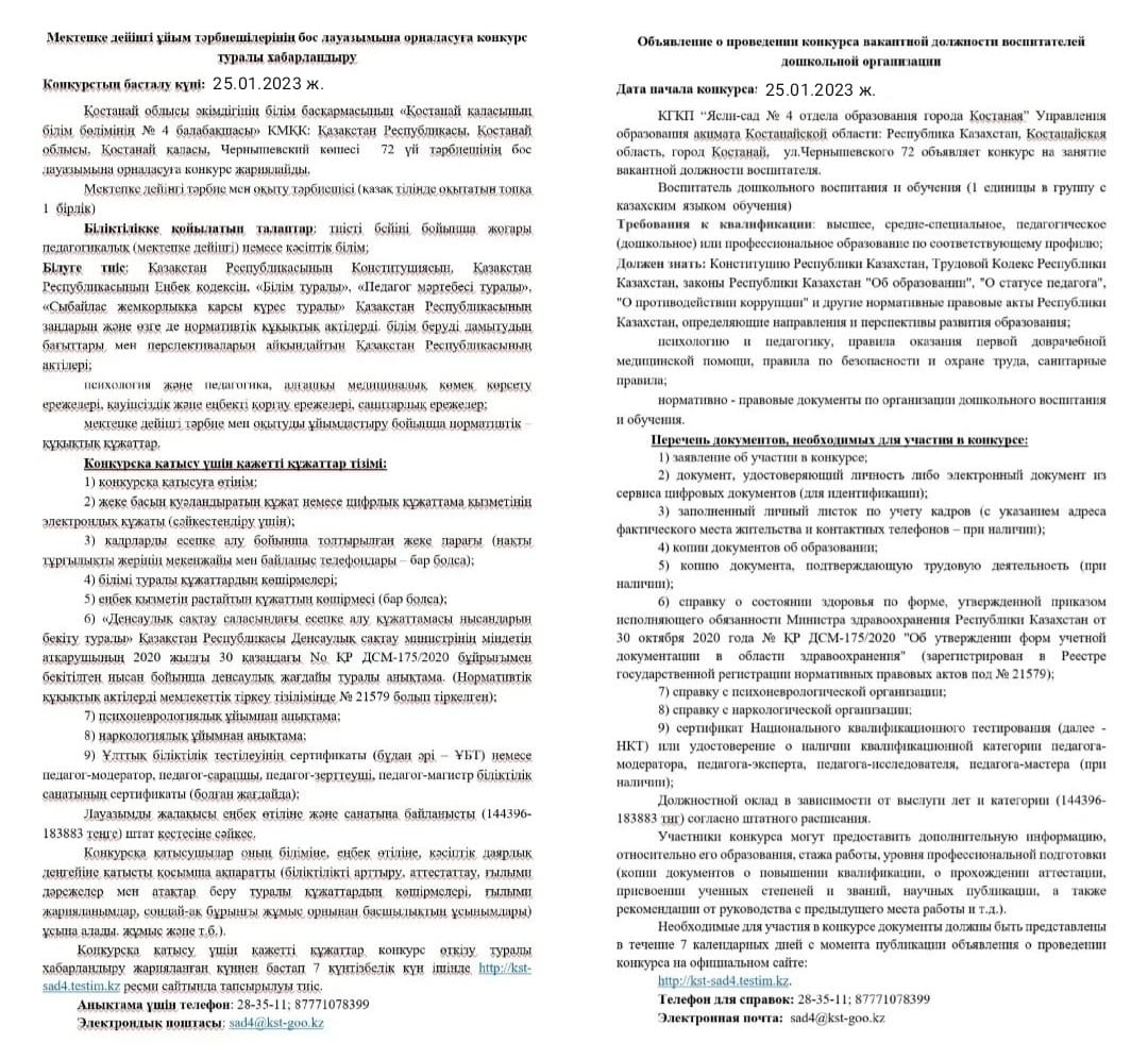 Мектепке дейінгі ұйым тәрбиешілерінің бос лауазымына орналасуға конкурс туралы хабарландыру!