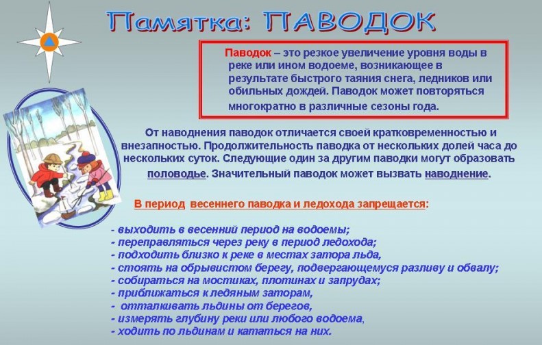 Балаларды ересектердің қадағалауынсыз өзенге жібермеңіз, Оларға мұз кету және көктемгі су тасқыны кезіндегі сақтық шараларын түсіндіріңіз. Есіңізде болсын, су тасқыны кезінде, тіпті мұз аз болса да, жазатайым оқиғалар көбінесе балалармен болады. Балаларға су тасқыны кезіндегі жүріс-тұрыс ережелерін ескертіңіз. Ағын су пайда болған кезде мұзға шықпаңыз, ал тасқын кезінде мұз үстінде сырғанау немесе жарылған мұз бойынша жүру қауіпті екенін айтыңыз!