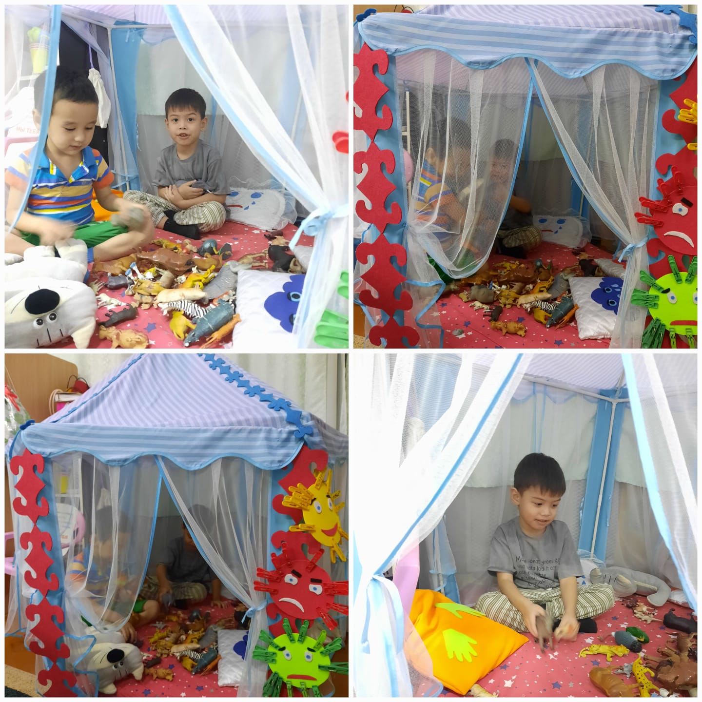 Біздің 4 бөбекжай-балабақшасында «Верблюженок» мектепалды даярлық тобында Оқшалану ұзақ мерзімді жобасы өтуде «Бақытты балақай» .Осы орталықта – балабақшадағы бүлдіршіннің тыныштандыратын, демалатын, сүйікті ойыншығымен ойнайтын, фотосуреттерді қарайтын, ойыншық телефон арқылы баланың анасына немесе әкесіне қиялынан қоңырау шалып, жақсы көретінін айта алатын орын. олар өте көп және күтуде; немесе жай ғана армандаңыз. Балалар әлі де өз сезімдерінің көріністерін басқаруды үйренеді. Сондықтан жиі ашулану, ашулану, қайғыру сияқты эмоционалдық көріністердің демонстрациясы бар. Айқайлауға арналған құмырада: егер бала агрессияны көрсетсе немесе ол жай ғана айқайлағысы келсе, ол бұрышқа барып, «Скреамер» құмырасын алып, оған айқайлай алады, яғни бала рұқсат беріп жатыр деп айта аламыз. осы уақытта «буды» шығарыңыз. Тіпті «ашудың нысанасында» ол сөмкелерді тастап, энергияны шашыратады. «Жылаған жастықты» құшақтап алған бала онымен көңіл-күйін бөлісе алады. Мұндай бұрышта бала басқалардан жасырынып, жинақталған жағымсыз эмоцияларын білдіре алады, қызықты тыныш ойындардың көмегімен қарбаластан құтылып, тыныштықта демалуға болады.