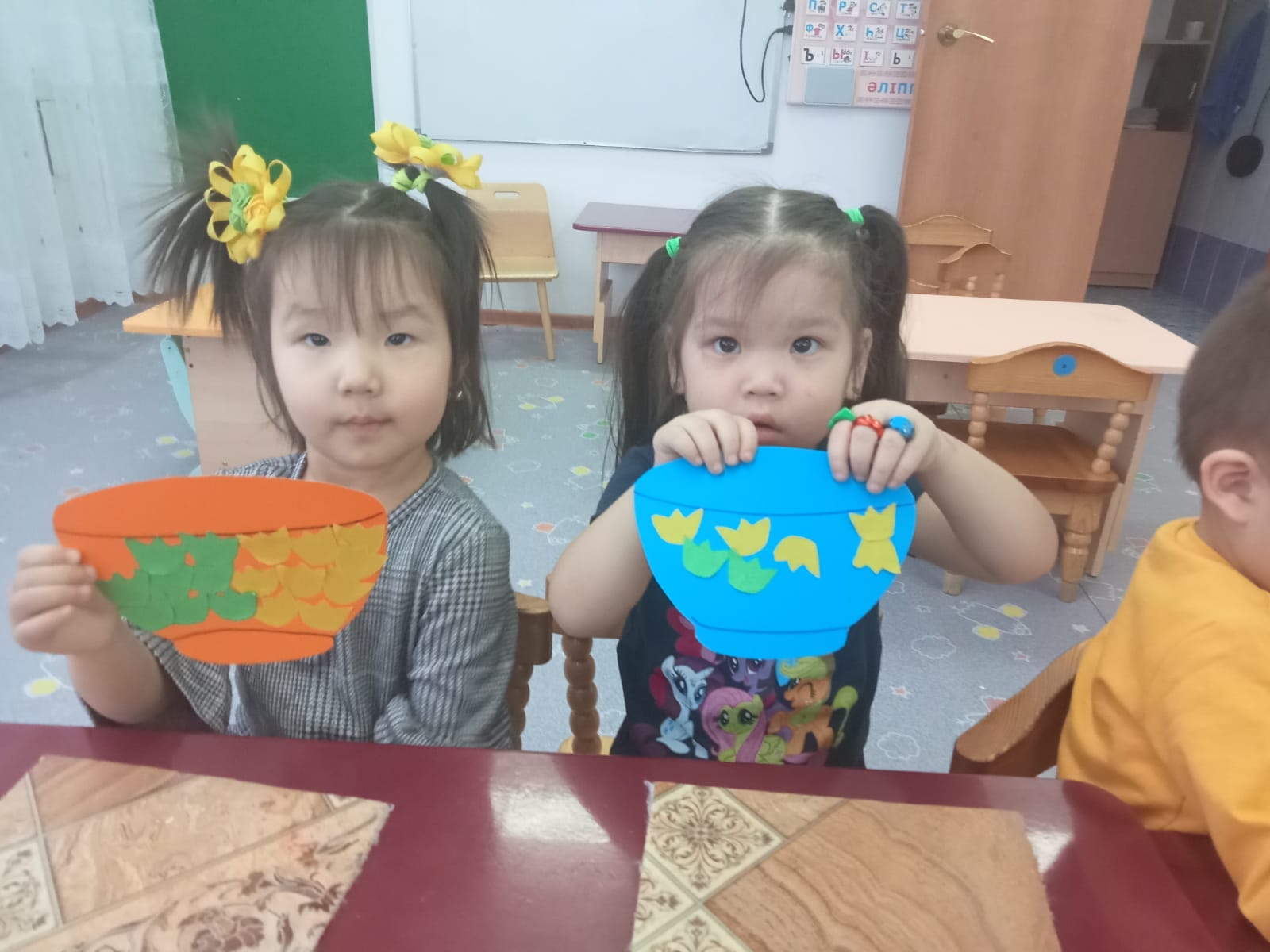 Мақсаты: қиылған дайын пішіндерді қағаз бетіне дұрыс орналастыра білуге, түстерді, көлемді ажырата білуге үйрету. Көктем туралы білімдерін толықтырып, гүлдің атымен таныстыру.Балалардың сөздік қорын молайтып, ой-өрісін, тілін, қиялын дамыту. Әдемілікті сезіне білуге, көркемдік талғамдарының жетілуіне ықпал ету. Табиғатты қорғауға, адамгершілікке, ұқыптылыққа, бастаған ісін аяқтай білуге тәрбиелеу. Тәрбиешілер: Есенеева М.Б.,Ергалиева Б.Г.