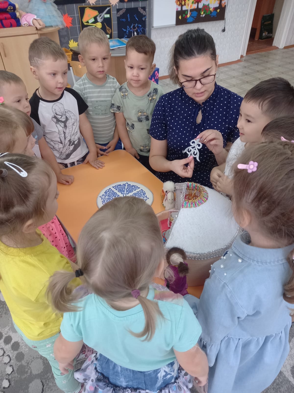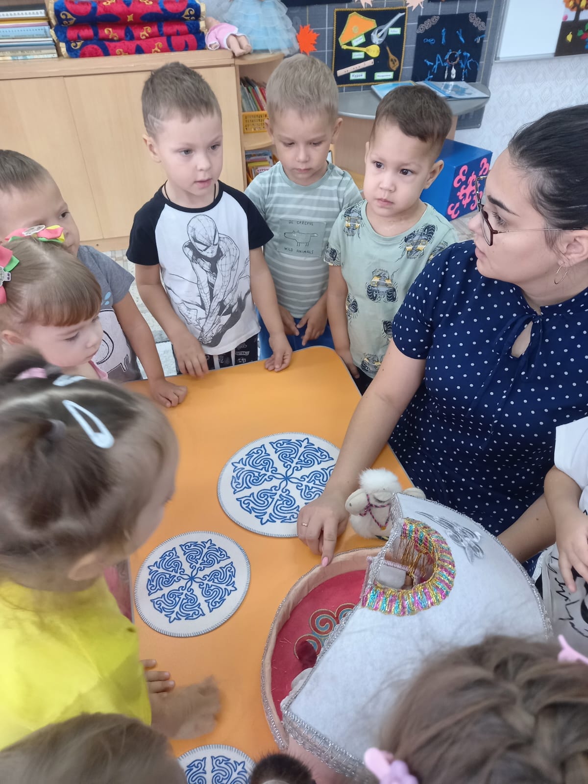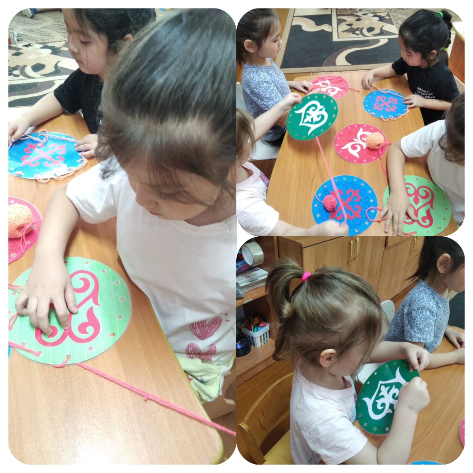 12.03.2025 ж Әр түрлі жастағы «Ертегі» тобында тақырыбы: «Әжемнің өрнегі» қол өнері болды. Мақсаты: Балаларды әр түрлі оюымен таныстыру, есте сақтау қабілеттерін шындау және балалардың ұсақ қол моторикасын дамыту. Қазақтың қолөнерін құрметтеуге, өнердің мәңгі өшпейтін ою - өрнектердің сыры мен қырын білу арқылы, балаларды пласстмас инемен дұрыс пайдалануға үйрету. Шыдамдылыққа, ұқыптылыққа, шапшаңдыққа тәрбиелеу. Тәрбиешілер : Есенеева М.Б., Коскабаева М.С.a